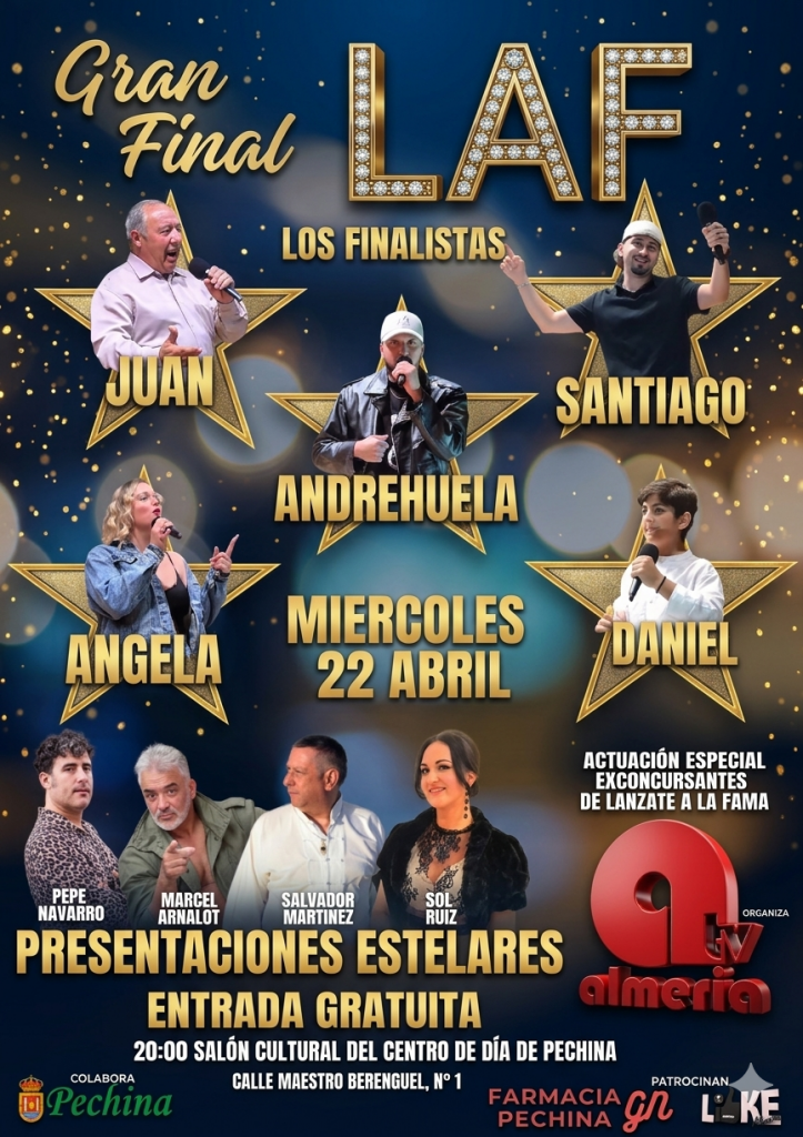 PECHINA. – La espera ha terminado. Tras semanas de intensa competición, el escenario del Salón Cultural del Centro de Día de Pechina se prepara para recibir el evento más esperado del año: la Gran Final de LAF (Lánzate a la Fama). Organizado por Almería TV, el certamen busca coronar a la nueva voz o talento de la provincia en una velada que será transmitida para llevar la magia del directo a todos los hogares.